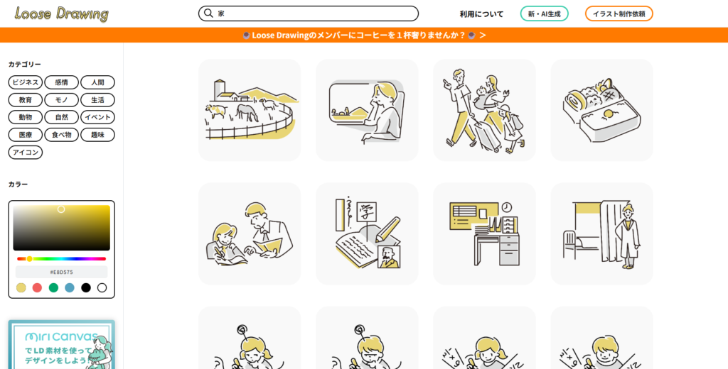 Loose Drawingは、やわらかい線とシンプルな色使いが特徴の、おしゃれなイラストが揃うサイトです。家づくりに関する具体的なイラストよりも、暮らしの雰囲気や家族の姿を表現したイラストが多く、資料やSNSで「理想のライフスタイル」を伝えるときに適しています。住宅会社との打ち合わせでも、暮らし全体のイメージを共有するために使われることがあり、間取り以前の“ライフスタイルの方向性”を整理する場面で効果を発揮します。富士・富士宮の家づくりでも、自然と調和した暮らし、家族がゆったり過ごせる住まいなど、抽象イメージを伝える際に役立ちます。イラストの雰囲気が統一されているため、資料全体の印象をまとめやすい点も魅力です。