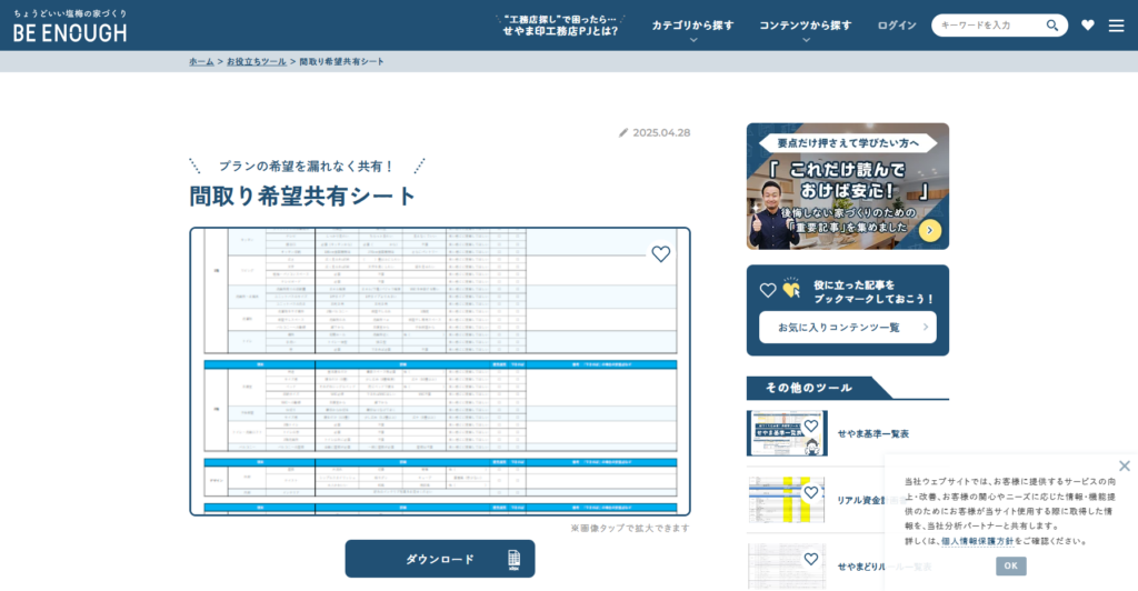 BE ENOUGH様が提供している「間取り希望共有シート」は、間取りの希望を漏れなくプランナーに共有するためのシート。 良い間取りができるかどうかは、希望共有(ヒアリング)が重要です。なんとなくのイメージや口頭での要望だけでなく、「どんな暮らしをしたいのか」「何を優先したいのか」を具体的に言語化して伝えることが欠かせません。