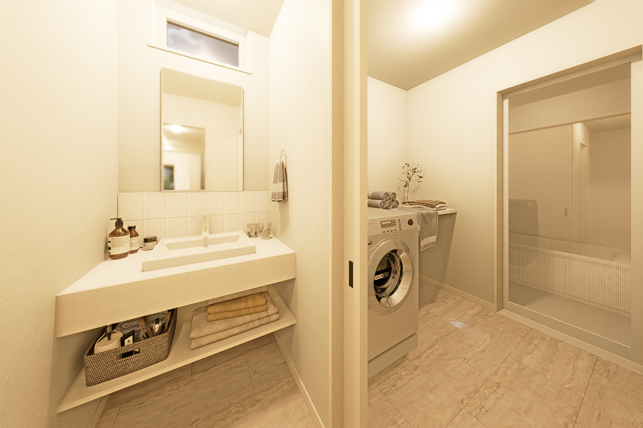 洗面台とランドリーを近くにまとめ、日々の「洗う・干す・片づける」をスムーズに。忙しい共働き世帯にも嬉しい動線です。