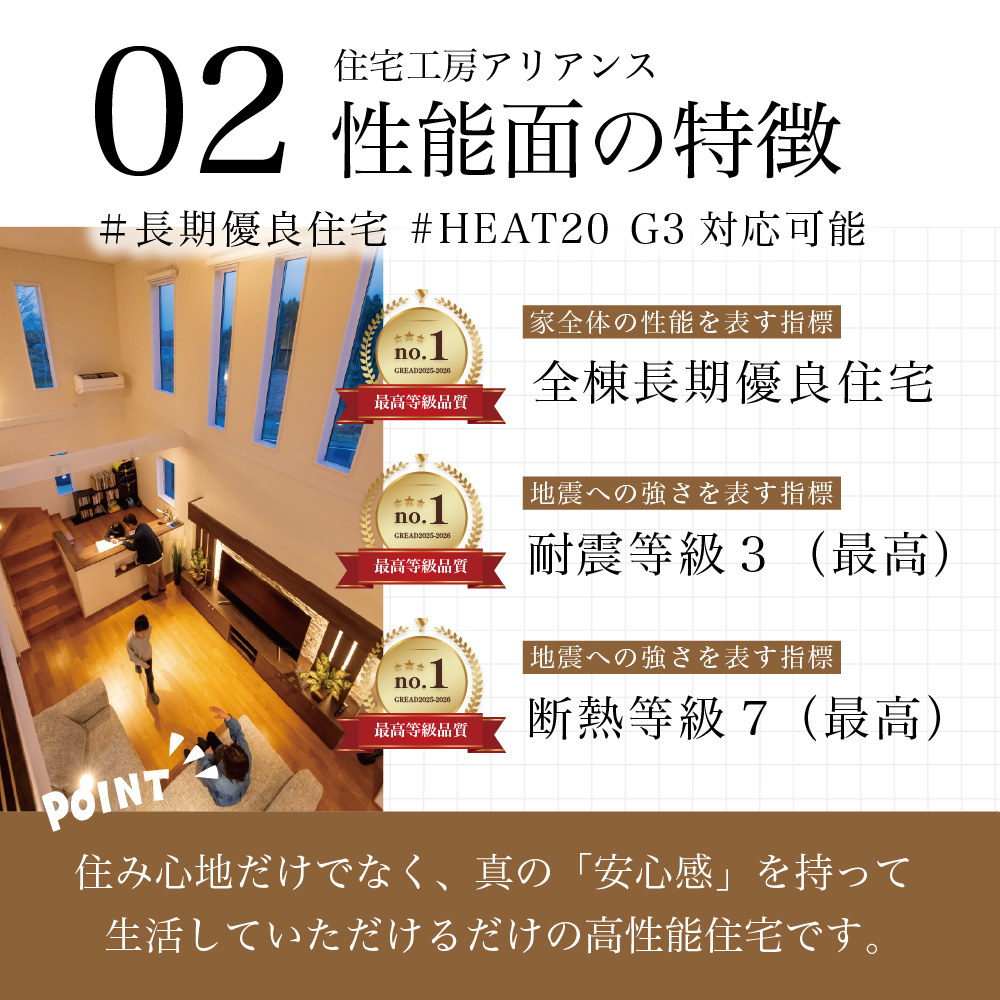アリアンスの住宅は、国が定めた安全・安心の基準「長期優良住宅」の認定を全棟で取得しています。