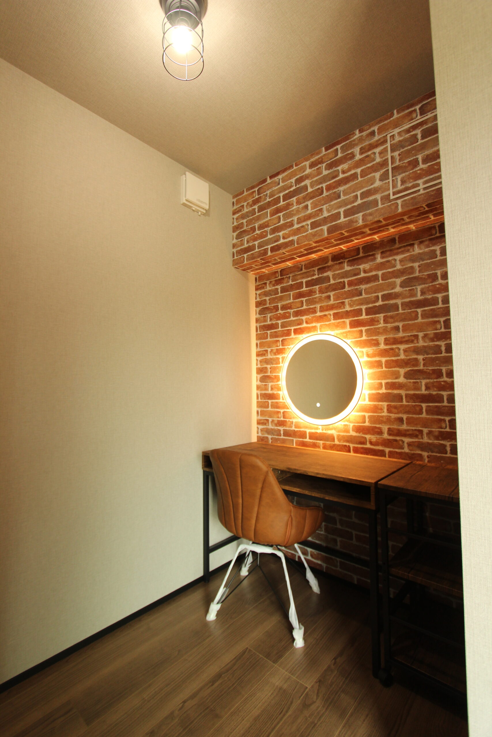 寝室の奥には、落ち着いた雰囲気のメイクルームを配置。身支度の時間を慌ただしい作業にするのではなく、自分だけの特別なひとときとして楽しめるプライベート空間に仕上げました。朝の準備や夜のリラックスタイムも、心にゆとりをもたらします。