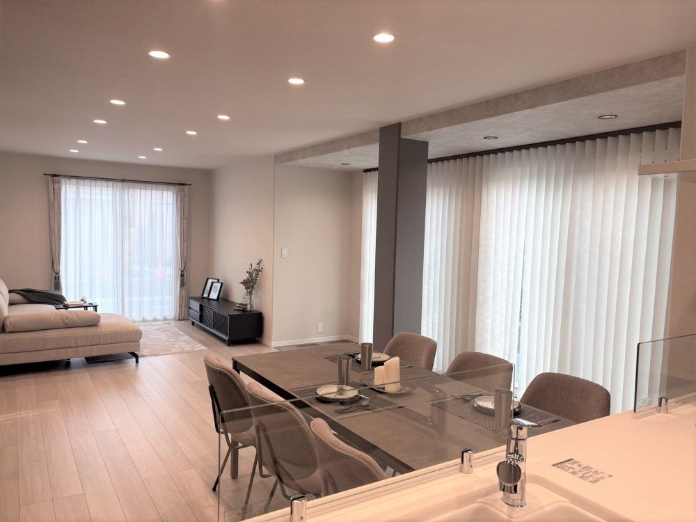 室内はペニンシュラ型キッチンを中心に、ダイニングからリビングへと一直線につながるレイアウトとし、家族が自然と集まりやすい開放的な空間を実現しています。