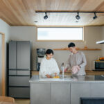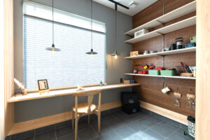 土間は単なる収納や通路ではなく、家族が集う土間リビングとしても機能し、自然と人が集まる憩いのスペースになっています。隣接するワークスペースは土間とゆるやかにつながり、仕事や趣味に集中しながらも家族の気配を感じられる設計です。