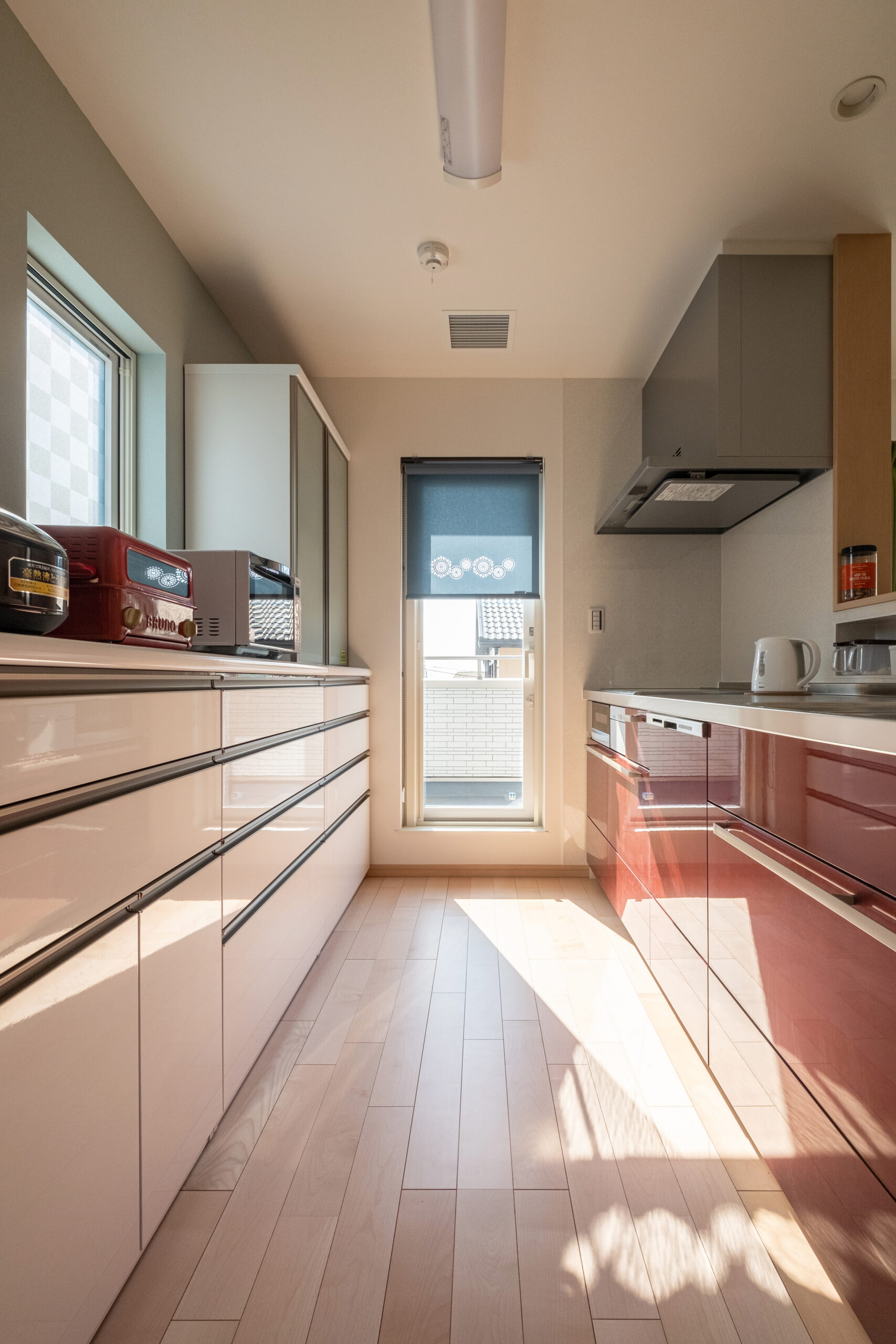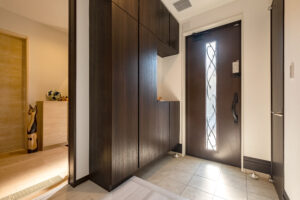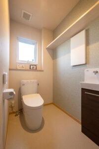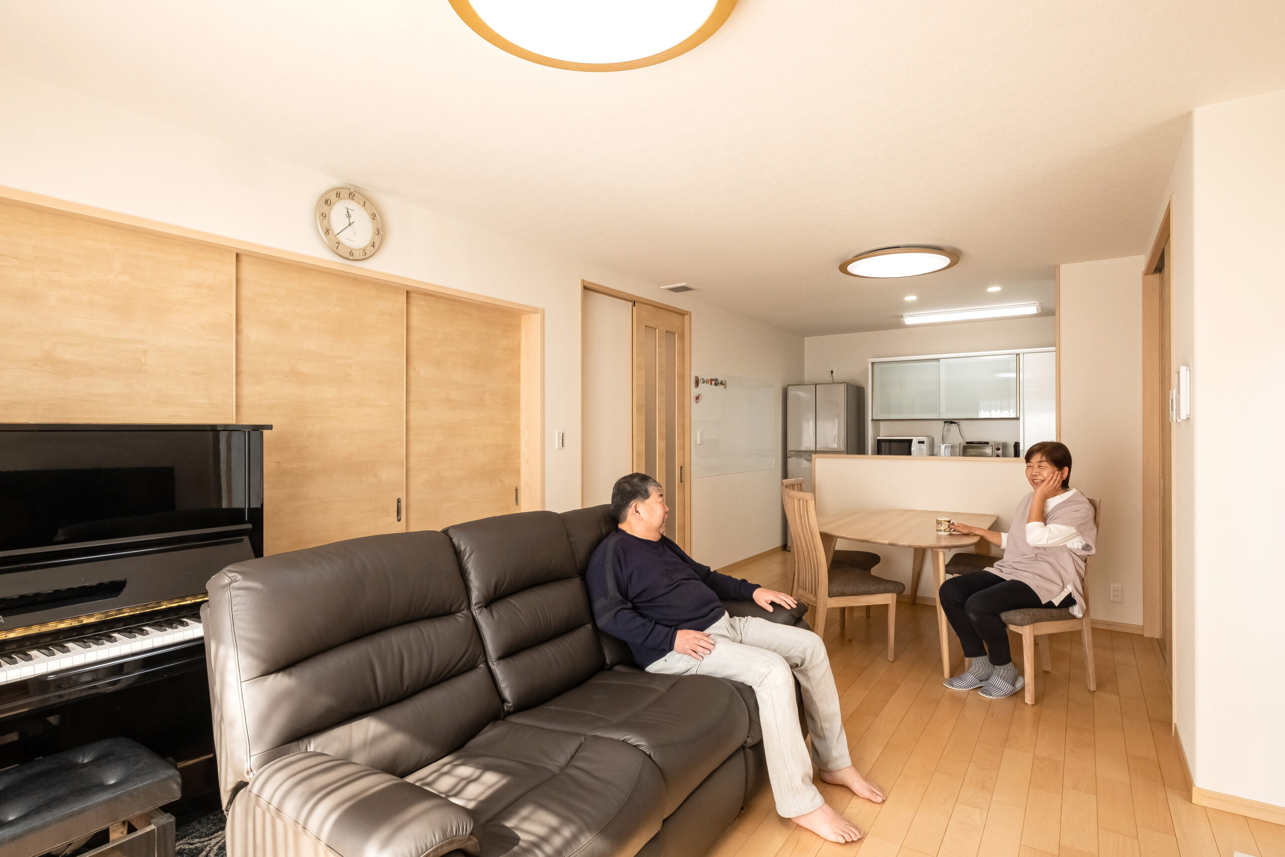 要望を叶えた各世帯の住まいは、1階の親世帯は、将来のことも考えたバリアフリーでトイレや浴室は広めにし、介護のしやすさを考え、玄関のすぐ横を和室にしました。2階の子世帯は、廊下はほとんど作らず、広い生活空間と多めの収納スペースを設けました。そして一年を通して家じゅうが20℃台の快適で省エネな全館空調を設置し、ご家族みなさんのご要望を取り入れた住まいとなりました。