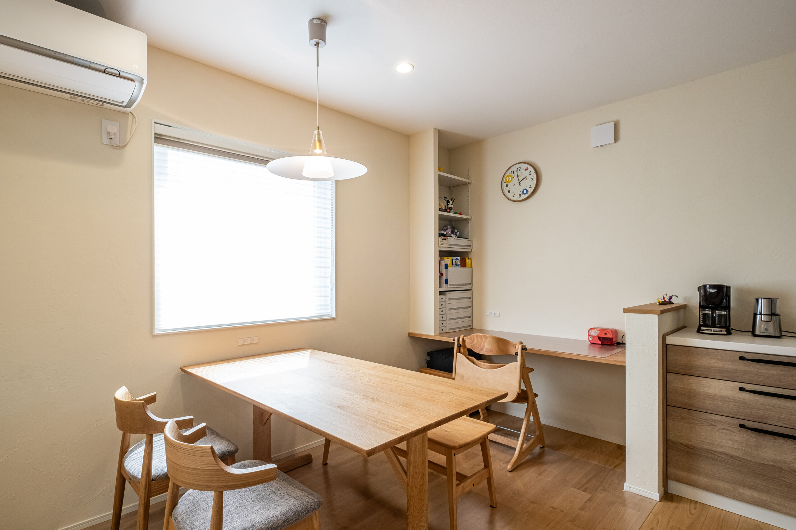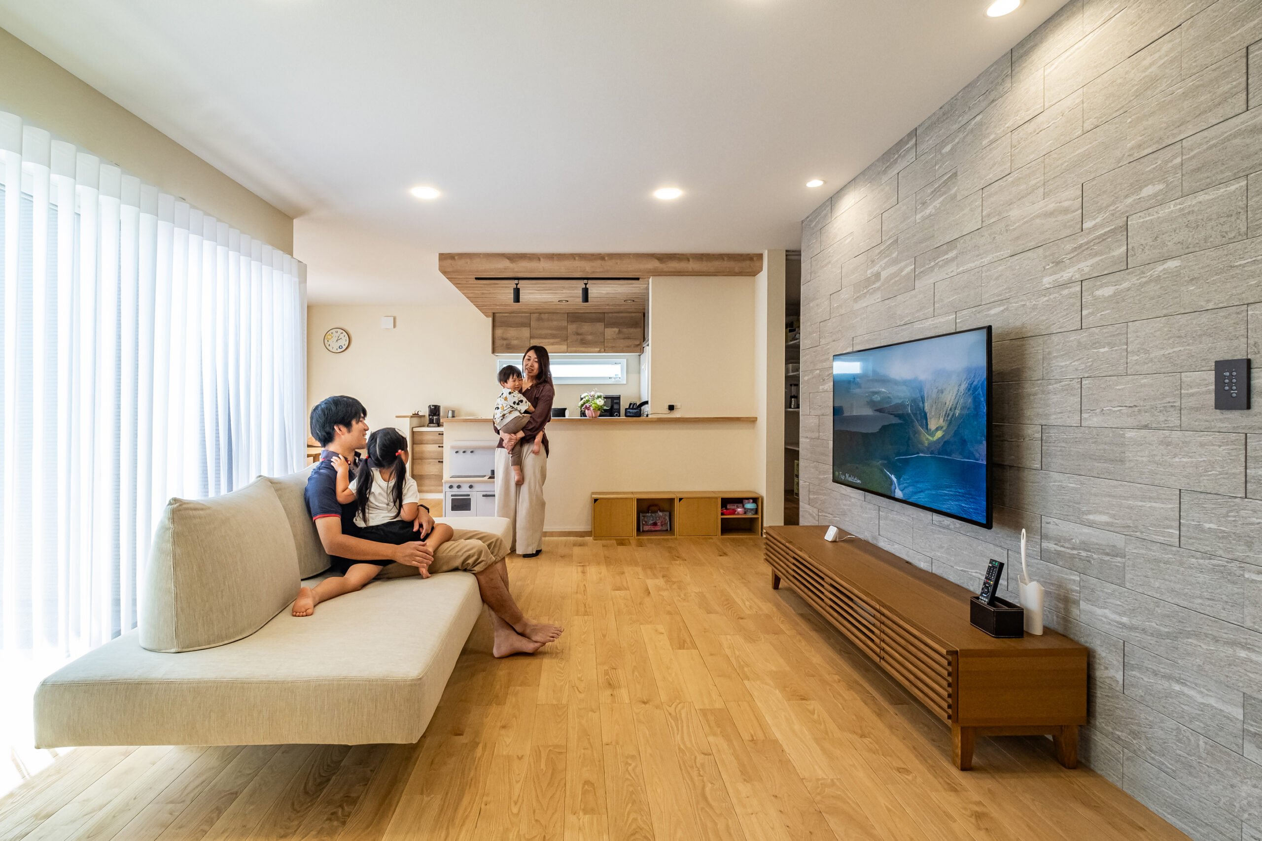 ご夫婦の要望を箇条書きにして、プランのベースとしました。無垢材と塗り壁が包むLDK、家事を楽にする水回り、電気配線がすっきりまとめられたテレビ収納など、細部まで丁寧に提案。年間を通して快適性と省エネ性を感じられる住まいに仕上がりました。