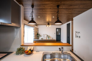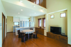 木の質感と吹き抜けの開放感が、暮らしを包み込む家