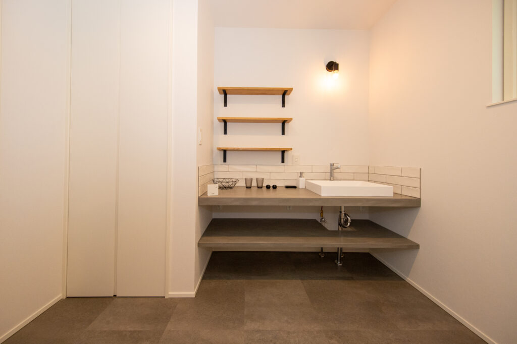 水回り空間を西側に直線配置することでシンプルな家事導線をつくり家事の効率化を意識した間取りに。脱衣室と洗面所を分け、広くとった洗面室は、ランドリールームとしても使用でき、洗濯効率がアップします。イデキョウホームの全館空調は、大風量小温度差なので、乾きもいいのがポイントです!家事動線の工夫で毎日を暮らしやすくできます!
