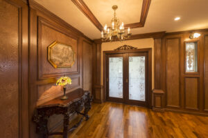 重厚な木材を贅沢に使ったパネルや、繊細な装飾が施された框、天井に広がるクラウンモールディング——まるで洋館のような雰囲気をまといながら、住まいとしての居心地もきちんと両立しています。