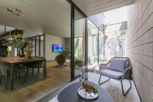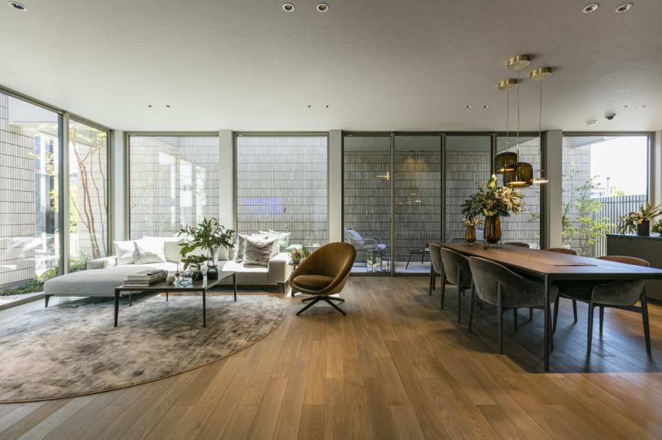 外からの視線を遮る壁に囲まれた“コート(中庭)型空間”に向けて、リビング・ダイニングの大きな連続サッシを配置。カーテンに頼らず、光と風、緑を感じる“自然との共生”を日常に。