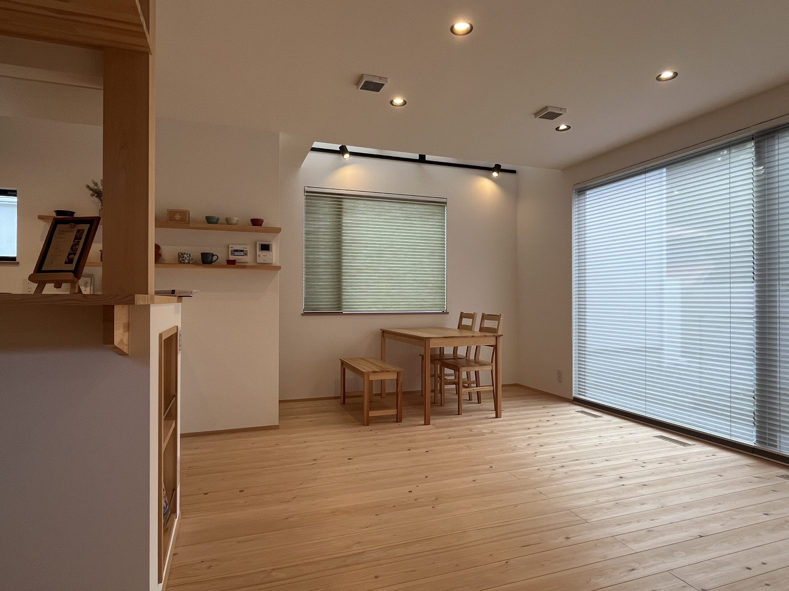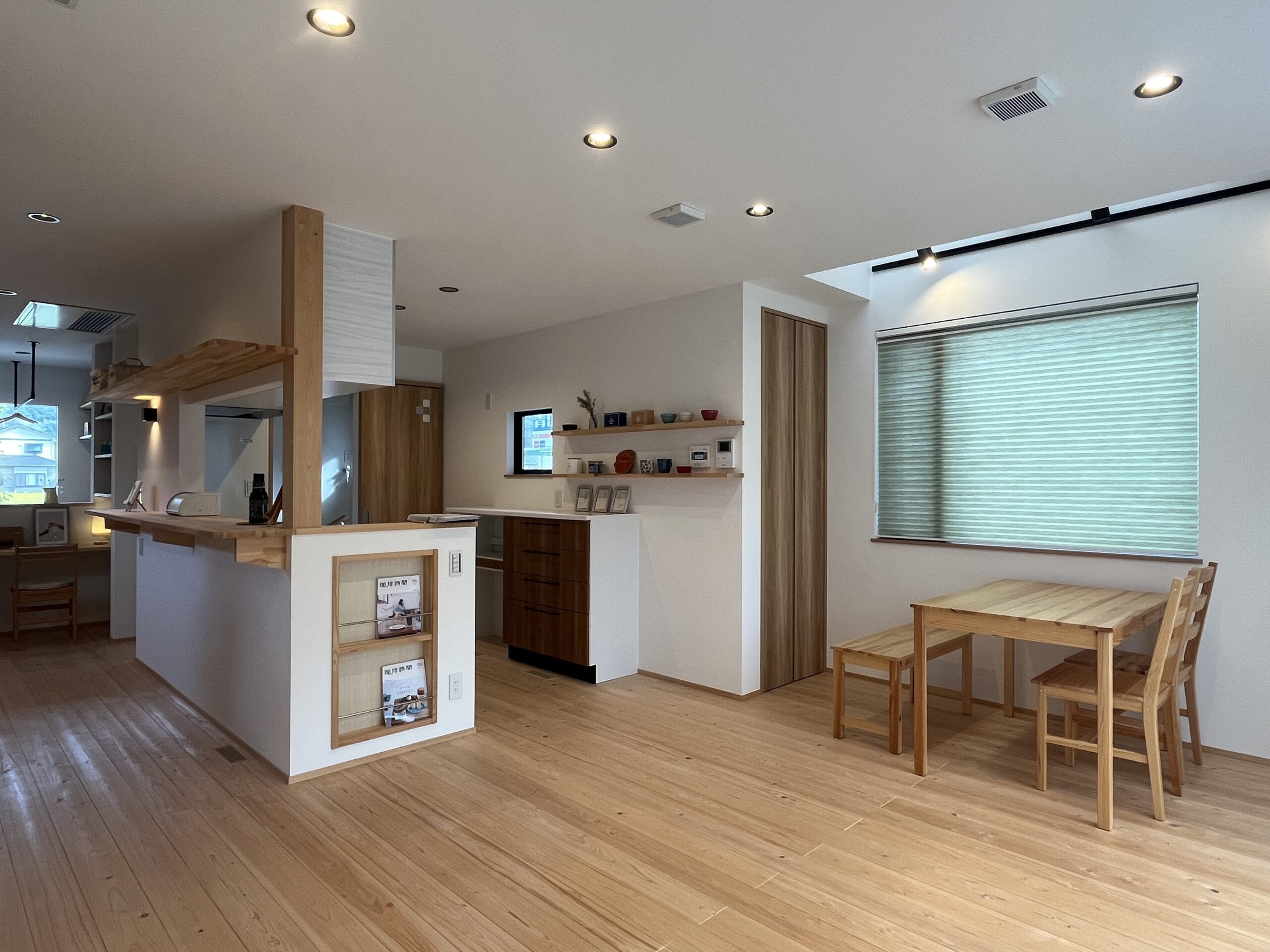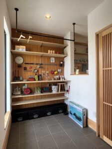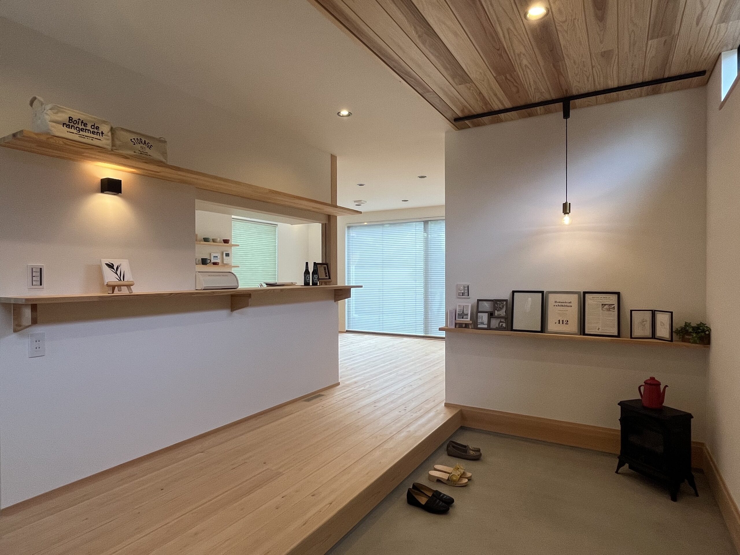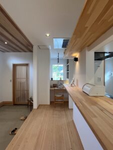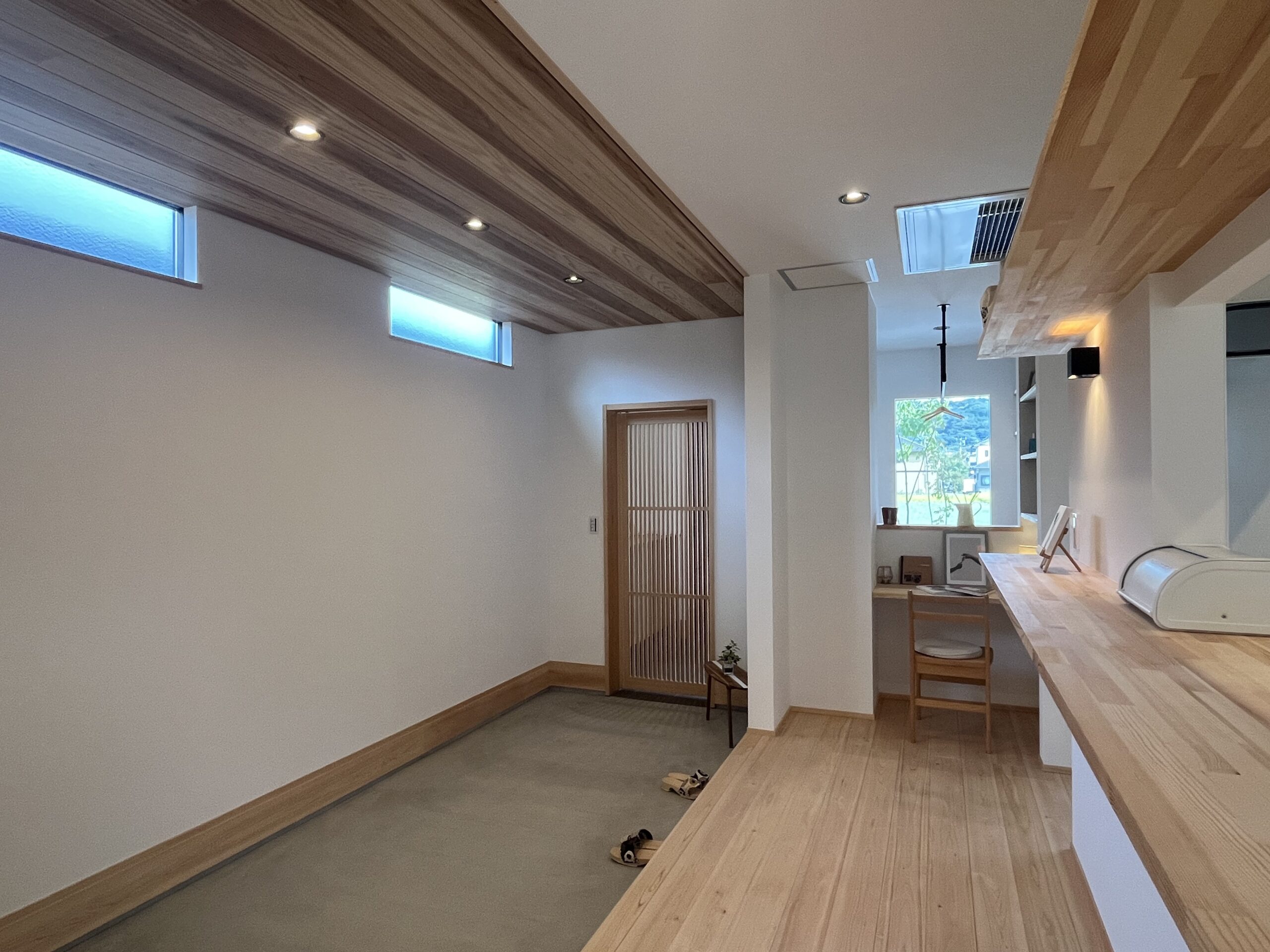 廊下を設けない土間スタイルを採用することで、住まい全体に無駄のない広がりと、暮らしの自由度をもたらした住空間です。玄関から続く土間スペースは、単なる通路ではなく、カフェスペースや趣味スペースとしても活用できる多目的な場所。